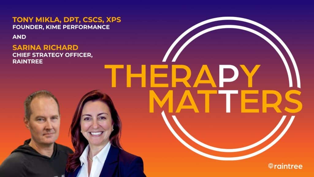 Sarina Richard (00:03): I am Sarina Richard, and you’re listening to Therapy Matters presented by Raintree. Therapy Matters explores the ideas and innovations reshaping rehab therapy. All right. Well, Tony, thank you so much for joining me today. Welcome to Therapy Matters, and I’d love if you could just give us your name and what organization you’re with, and then we can go through your background. Tony Mikla (00:29): Awesome. Well, thanks for having me first off. It’s great to be here. Always exciting. So my name’s Tony Mikla, physical therapist, strength coach. I’ve been doing it for 20 something years. We started KIME Performance Physical Therapy based out of Sacramento, and we have offices in Nevada as well in Reno and Vegas. So we started that nine years ago this month. Sarina Richard (00:48): Congratulations. Tony Mikla (00:48): Yeah, so it’s been a fun run. We’ve had great growth throughout the process, but our intention in starting that was to really serve the athletic population. I think it’s something that we all hope for in PT as we come out. Everybody, not everybody, but some who want to be sports physical therapy. So we really strive to actually deliver what we hope to deliver as a clinician. There’s so many things that put stumbling blocks in the way as a clinician, whether it be documentation or insurance or different restrictions that we all complain about as therapists, but we try to do our best job to really modify those efficiencies so that the therapists can really put themselves forward and do what I think they’re trained to do and be the best at. Sarina Richard (01:29): Yeah. How did you get started in the industry? Tony Mikla (01:31): Yeah, so it’s been a journey. So I got injured in high school, went through a little bit of a rehab process, was frustrated by it like most people, I think, frustrated that it took too long, wanting to get back to play. It was my senior year, I was missing games and I was playing basketball, so I was really frustrated. So I was like, man, there’s got to be a better way. There’s got to be a faster way to accomplish my goals and get this process going. Why can’t I heal faster? And that’s motivated me from that day is that same idea, is how can I help other people get back faster and use the best that science has to offer, maximize the body’s potential to get back to where they want to be. So that’s the driving force. So that’s when I got started, and then I had some great opportunities. (02:16): I went to the University of Arizona and was with the basketball team there and the men’s basketball team, which was really, really a top caliber group. We were top five in the country my entire time there with them. So that allowed me to see what elite performance and professional athleticism look like. I think we had about 15 or 16 guys go to the NBA from that group. So it really showed me, wow, this is what elite athletes do, how they train, what it is. And that just kind of further indoctrinated me and got me excited about what the body can do and what the potential is. So that’s always been my chase is like, how can we do it better? How can we get the most out of the body? Sarina Richard (02:52): That’s interesting because a lot of times you think about PT as something happened and need to go get fixed, and you’ve got a little bit of a different frame of reference, which is how do I optimize my performance and how do I make my body better faster? So it’s more of a proactive approach to your body. Tony Mikla (03:12): Oh, a hundred percent. So I mean, in the field as I studied movement and performance and obviously injury, they’re really one and the same. Injury prevention is actually the same as rehab for the most part, in my opinion. You start looking at why does injury happen and the causes are maybe more poor movement if it’s non-contact, poor movement, quality, fatigue, a couple different factors. So if you can train from performance standpoint to mitigate them of those problems, we can prolong someone’s career ability to play. So yeah, I’m on both sides of the equation all the time. We actually started a nonprofit this last year that focuses on working with high schools and working with youth athletes as well, as well as any tactical operator, so like firefighter, police, et cetera. So we do a process where we evaluate athletes, teams, tactical groups and evaluate their guys and say, here’s your risk. Here’s a risk profile based on the evaluations that we do. So it’s really nice to be like, hey, we can avoid some of the terrible things that happen. Put myself out of a job hopefully and say, here’s some of the terrible things that go on and let’s see if we can get in front of them. Sarina Richard (04:20): Proactive health is such a hot topic right now. We need to find a way to get the proactive PT to get that reimbursed because I think it’d make a huge difference. Tony Mikla (04:31): Yeah, it does. I mean, it takes a motivated clientele for sure, but if you look at, I had some opportunities in my time to work with special forces and the Navy SEAL teams and then certainly work with pro teams and stuff. And when you’re working with those groups, that’s what it’s all about. When you talk about performance, it’s about what can we do to maximize performance, make sure the mind is sharp, maximize healing potential, decrease injury risk. So that’s where a lot of these things come from. Sleep’s been a hot topic, and then of course the effects of stress, all the different recovery modalities, which a lot of them have taken from our industry is like, Hey, we’re using all these different things to help people recover so they can perform at an optimal level, and we’ve been using them to rehab people’s injuries. So it’s fun to be on both sides, and I think that we can have greater impact that way. That’s one of the things that’s kind of wild in our field. Obvi